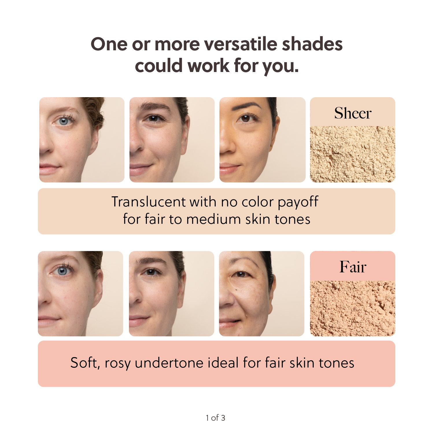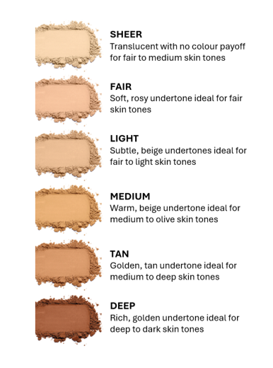 SHEER – a translucent no colour option for fair to medium skin tones.